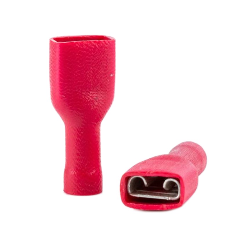Set van 50 volledig geïsoleerde vrouwelijke vlakstekerhulzen met een tabmaat van 0,8 x 4,8 mm, geschikt voor draaddiktes van 0,5 tot 1,5 mm² en uitgevoerd in de kleur rood.
