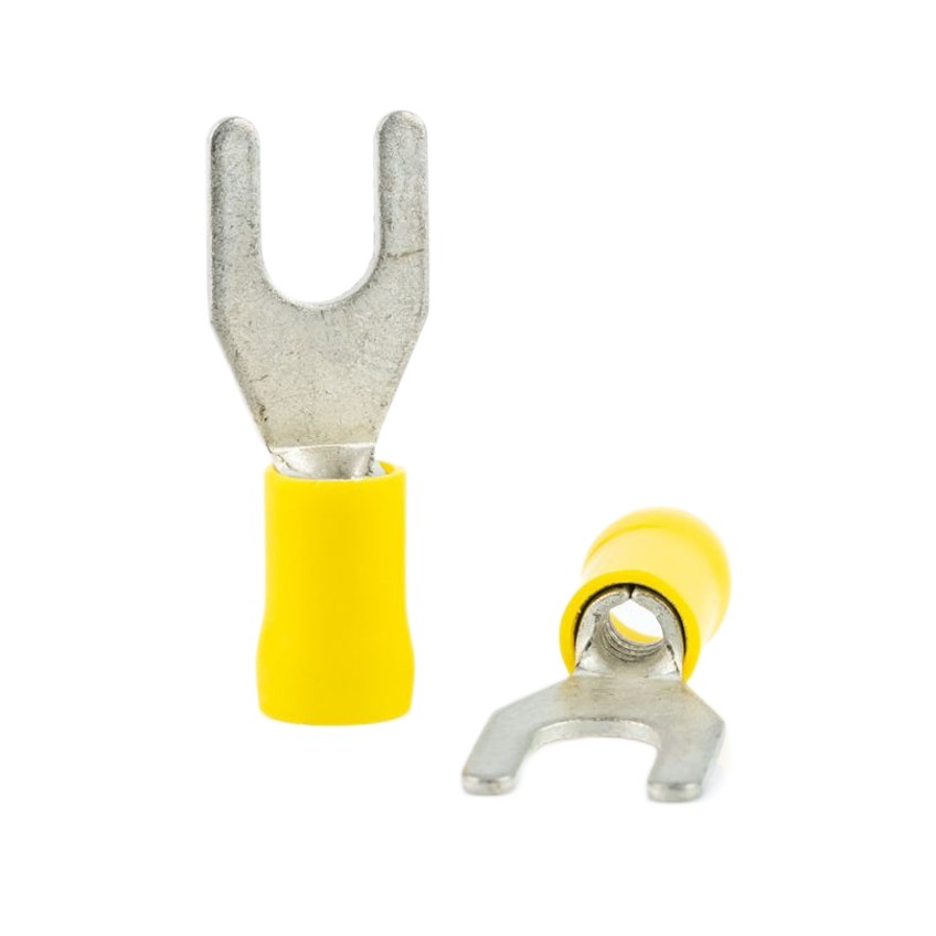Set van 50 gele vorkkabelschoenen met een Ø 4,3 mm, geschikt voor draaddiktes van 4,0 tot 6,0 mm². Ideaal voor stevige, betrouwbare en veilige elektrische verbindingen.