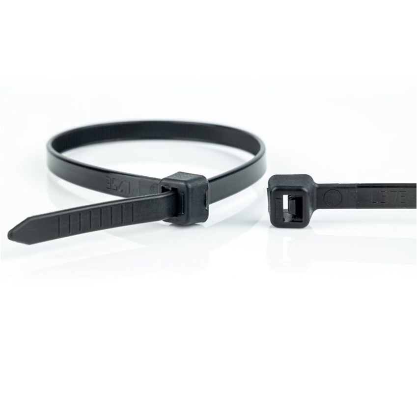 Set van 100 zwarte kabelbinders, 13 mm breed en 580 mm lang, vervaardigd uit polyamide 6.6. Ideaal voor het bundelen en organiseren van grote kabelbundels en objecten, zowel binnen als buiten.