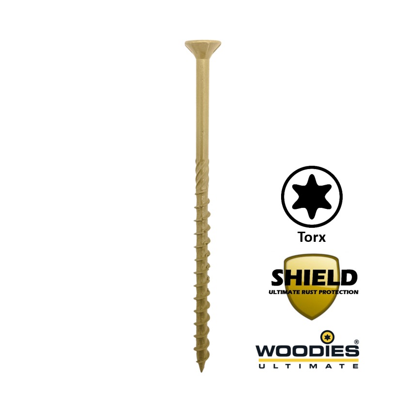 De Woodies® Ultimate houtschroeven met deeldraad, Torx aandrijving en verzonken kop zijn voorzien van een Shield-coating, bestaande uit gehard staal, verzinkt en behandeld met een antiroestcoating voor maximale sterkte en corrosiebestendigheid, ideaal voor buitengebruik.