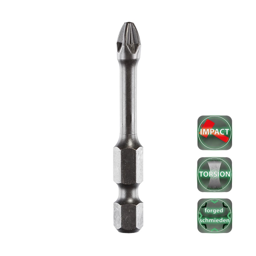 De Cobit Blade 1/4" E 6,3 – PZ TORSION IMPACT is een slijtvaste PZ-bit van 50mm met TORSION-zone en IMPACT-kwaliteit voor automatisch en zwaar schroeven met maximale duurzaamheid.