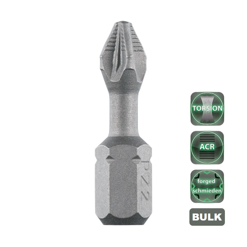 De verlengde TORSION-zone absorbeert piekspanningen en buigt gecontroleerd mee tijdens het schroeven. Dit voorkomt vroegtijdig breken van de bit en verlengt de levensduur aanzienlijk. De gesmede staalconstructie is bestand tegen hoge koppels en maakt deze bit ideaal voor herhaald intensief gebruik, ook in combinatie met slagschroevendraaiers. Verkrijgbaar in PZ1, PZ2 en PZ3, telkens 25 mm lang.
