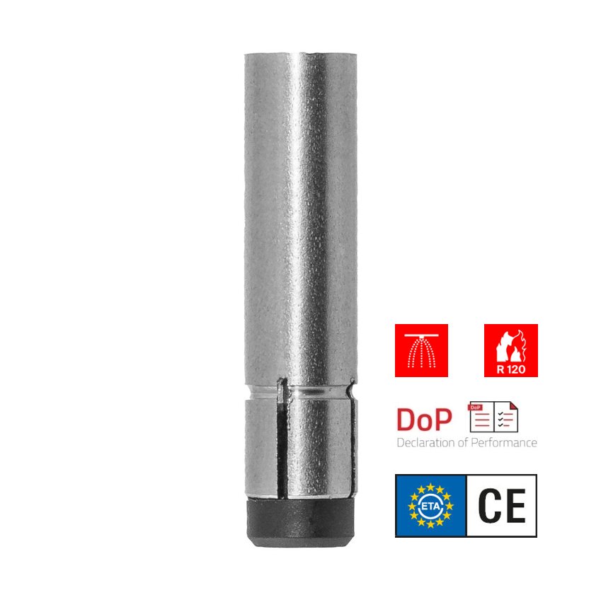 Het Fischer hulsanker TA M is een inslaganker met binnendraad van gegalvaniseerd staal voor de voorsteekmontage. Bij de montage wordt de conus in de spreidhuls getrokken en spant deze tegen de wand van het boorgat. De kunststof dop beschermt de schroefdraad tegen vervuiling. Zo blijft deze altijd goed beweegbaar. Het hulsanker is zeer geschikt voor de bevestiging van valbeveiligingen, installaties en machines in ongescheurd beton.