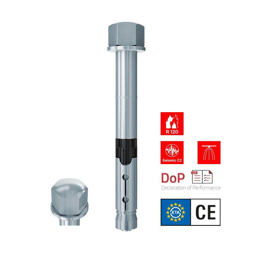 Het Fischer veiligheidsanker FH II-H met dopmoer en sluitring is een hulsanker van gegalvaniseerd staal voor optisch veeleisende verankeringen. Het Fischer veiligheidsanker FH II-H is bijzonder geschikt om consoles, staalconstructies en kabelgoten in gescheurd en ongescheurd beton te verankeren De Europese technische beoordeling en brandgeschiktheid overeenkomstig de brandweerstandsklasse R 120 garanderen veel meer veiligheid. Het anker wordt in de tijdsbesparende doorsteekmontage geplaatst. Bij het aandraaien van de schroef wordt de conus in de spreidhuls getrokken en spant deze tegen de wand van het boorgat. Het montagestuk wordt daardoor tegen het oppervlak van het verankeringsmateriaal getrokken. De zwarte kunststof ring voorkomt dat het anker meedraait en neemt de aandraaislip op.