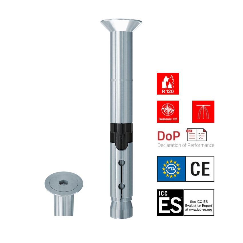 Het Fischer veiligheidsanker FH II SK met verzonken kop is een hulsanker van gegalvaniseerd staal voor optisch veeleisende verankeringen. De FH II-SK bijzonder geschikt om leuningen, staalconstructies en trappen in gescheurd en ongescheurd beton te verankeren. Het anker wordt in de tijdsbesparende doorsteekmontage lijnend met het oppervlak in het montagestuk geplaatst. Bij het aandraaien van de schroef wordt de conus in de spreidhuls getrokken en spant deze tegen de wand van het boorgat.