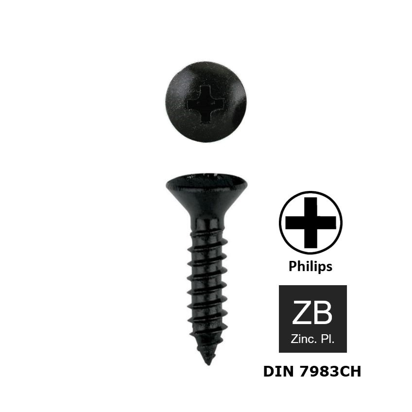 Deze plaatschroef Din 7983C zwart verzinkt met een bolverzonken kop en kruisindruk PH wordt gebruikt voor het bevestigen van plaatwerk, spuitgietwerk, plastic panelen e.d. en wordt voornamelijk voor industriële toepassingen gebruikt. De plaatschroef heeft een doorlopende schroefdraad tot net onder de kop en na het voorboren van een gat in het materiaal kan de schroef simpel en vlot ingeschroefd worden.