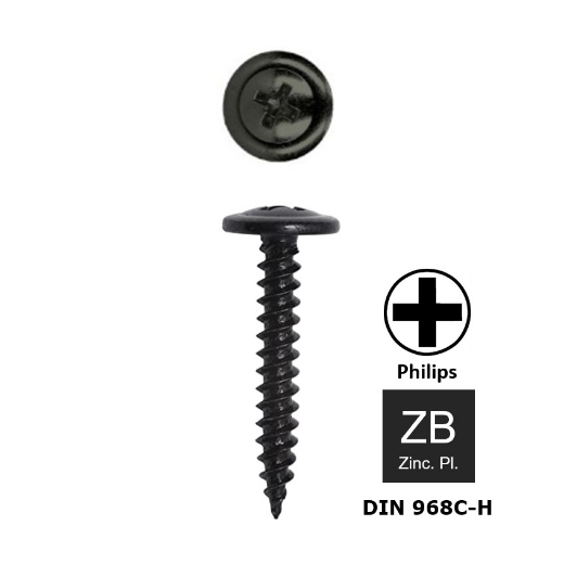 Deze plaatschroef Din 7983C zwart verzinkt met een bolverzonken kop en kruisindruk PH wordt gebruikt voor het bevestigen van plaatwerk, spuitgietwerk, plastic panelen e.d. en wordt voornamelijk voor industriële toepassingen gebruikt. De plaatschroef heeft een doorlopende schroefdraad tot net onder de kop en na het voorboren van een gat in het materiaal kan de schroef simpel en vlot ingeschroefd worden.