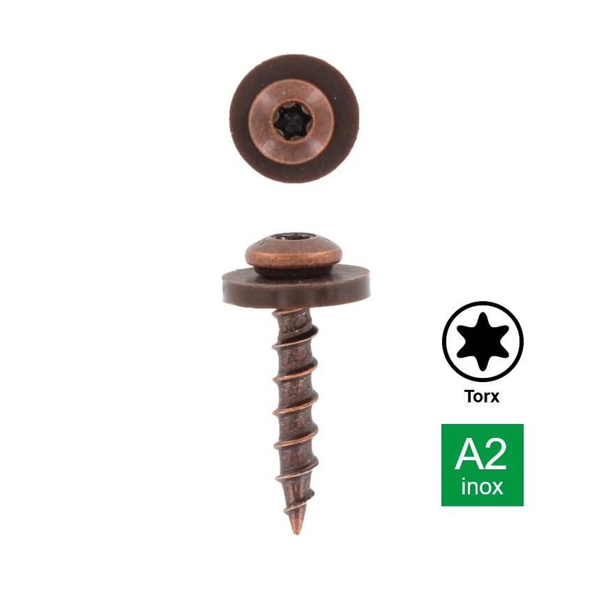 Plaatschroef voor vensterbank met bolle kop, grove draad en nylon ring Torx TX15 Bruin 3.9x32 inox A2