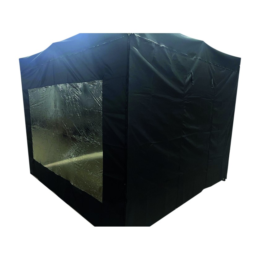Deze is een zijwand met raam voor een tent van 3m in het zwart. Het biedt extra beschutting en privacy. Gebruik het als een accessoire om je tentopstelling te verbeteren.