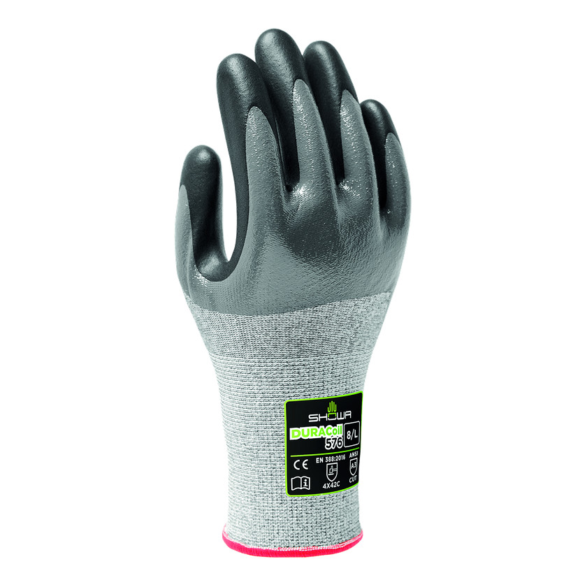 Deze is de werkhandschoen showa Duracoil 576 XL. Deze handschoen biedt duurzame snijbescherming in combinatie met langdurige grip. De nitril coating beschermt de hand tegen oliën, koolwaterstoffen en vet. Je ervaart uitstekende beweeglijkheid en vingergevoeligheid.