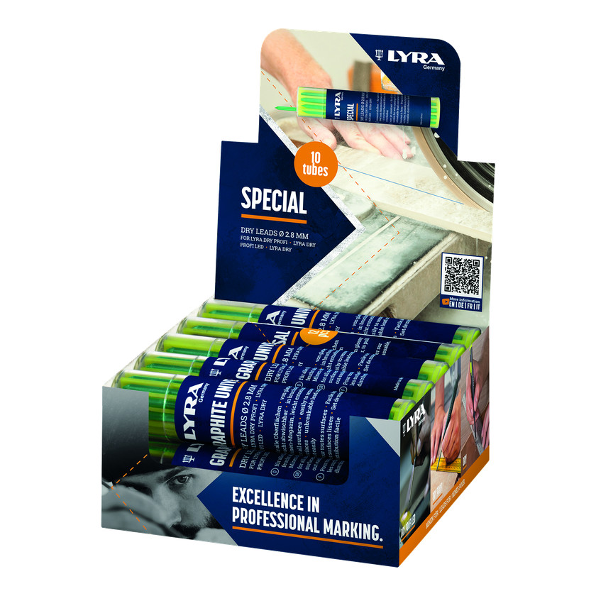 Deze Lyra dry vullingen biedt een soepele markeerervaring op verschillende oppervlakken. Het product heeft een verbeterd glijdend mechanisme voor gebruik met één hand. De geïntegreerde slijper en clip zijn handige functies. Het grafietpotlood heeft een diameter van 2,8 mm.