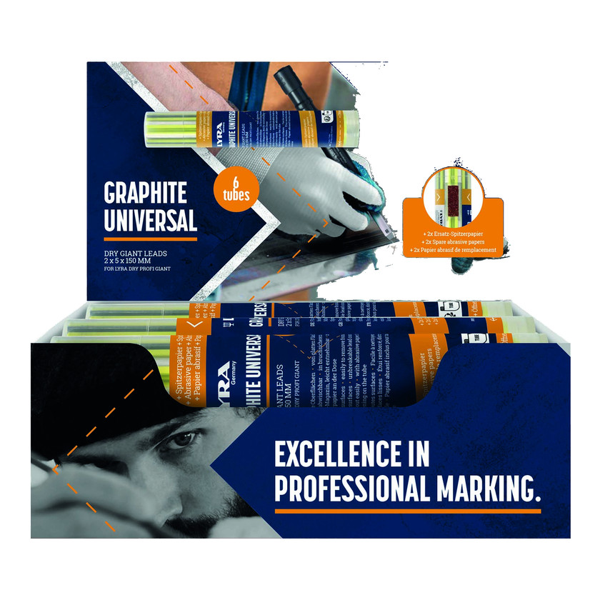 Deze Lyra Dry Profi Giant vullingen grafiet maakt nauwkeurige markeringen op meerdere materialen mogelijk. De vulling kan eenvoudig worden vervangen via de drukmechanisme van de marker. De grijze grafiet zorgt voor duidelijke zichtbaarheid op oppervlakken. Het is geschikt voor verschillende toepassingen, van industrieel gebruik tot knutselen.