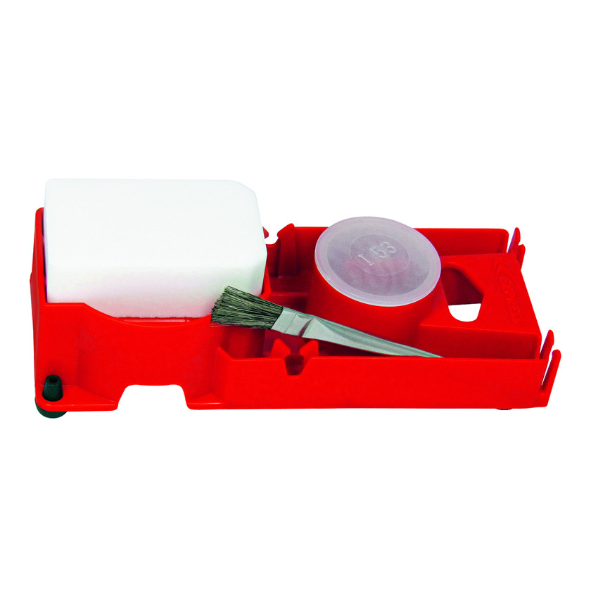 Deze express 9645 set ondersteunt voordakdekkers bij solderen. De houder biedt plaats voor een salmiaksteen, een arseenzoutammoniaksteen, een potje met vloeimiddel en een kwast. Er is ook een ruimte voor soldeerpasta, wat zorgt voor een efficiënte werkomgeving.