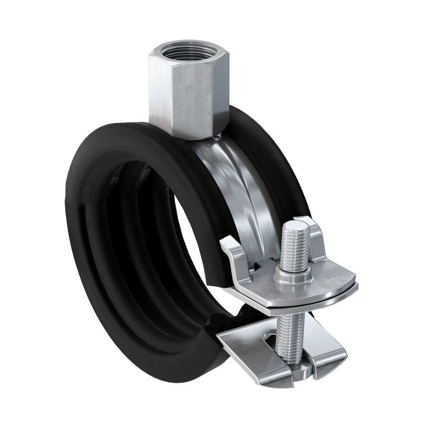De Fischer pijpbeugel FGRS met geluiddempende laag voor het bevestigen van pijpen. De snelsluiting maakt een eenvoudige en tijdbesparende montage mogelijk. Moer met combinatieschroefdraad M8/M10 voor de opname van draadstangen of stokschroeven.