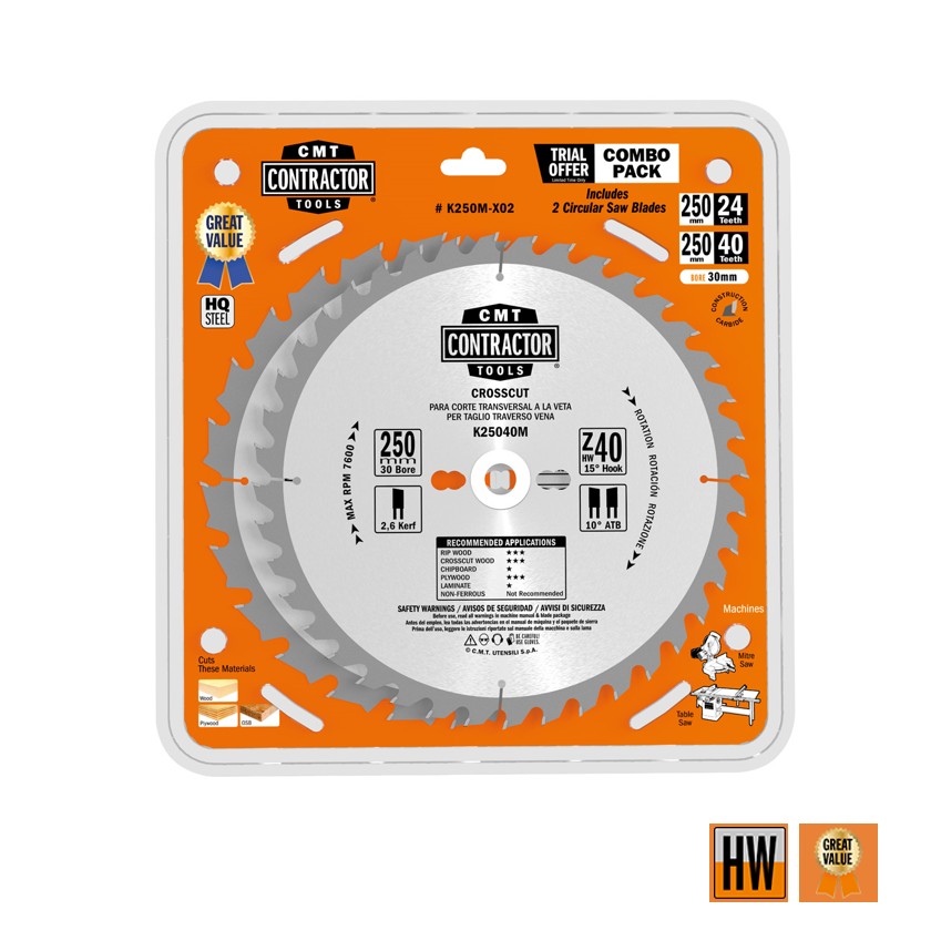 CMT Contractor set universele zaagbladen voor hout & OSB 250x30x2.6mm Z24 & Z40 HW - K250M-X02