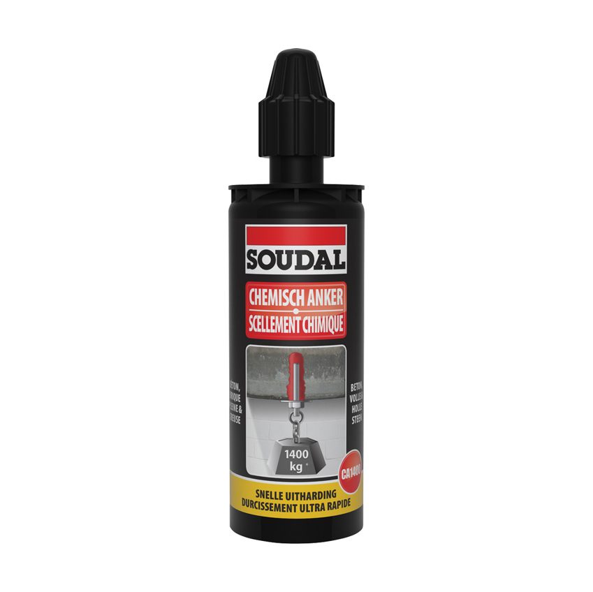 Soudal Chemisch anker CA 1400 is een tweecomponenten verankeringsmortel, voor het spanningsvrij bevestigen van draadstangen, ankers, wapeningsstaven, ankerhulzen, e.d. in zowel volle als holle bouwmaterialen, zoals beton, volle baksteen, holle baksteen, cellenbeton, natuursteen, gipskartonwanden, e.d. Het Chemisch Anker is speciaal ontwikkeld voor het bevestigen van zware lasten tot 1.400 Kg.