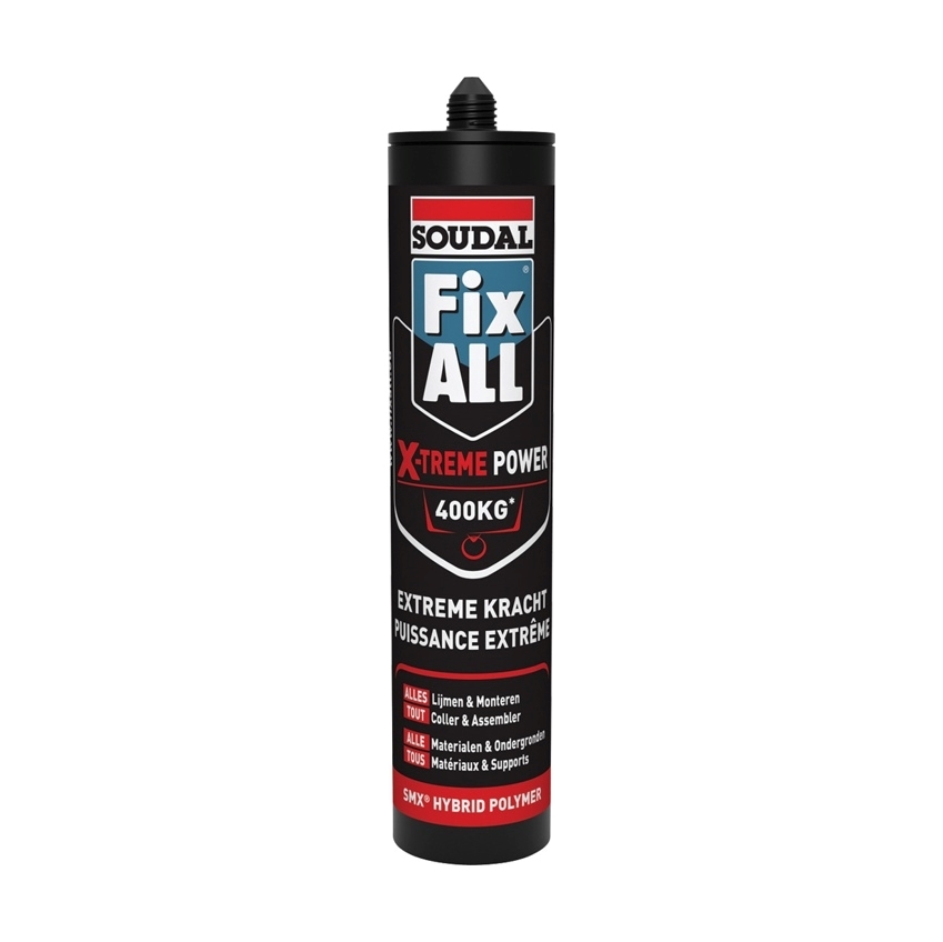 Soudal Fix All X-Treme Power is een Hybride montagelijm. Fix All X-treme Power is perfect voor het verlijmen van extreem zware lasten zonder ondersteuning (tot 400 kg/m²). Kan zowel binnen als buiten gebruikt worden.