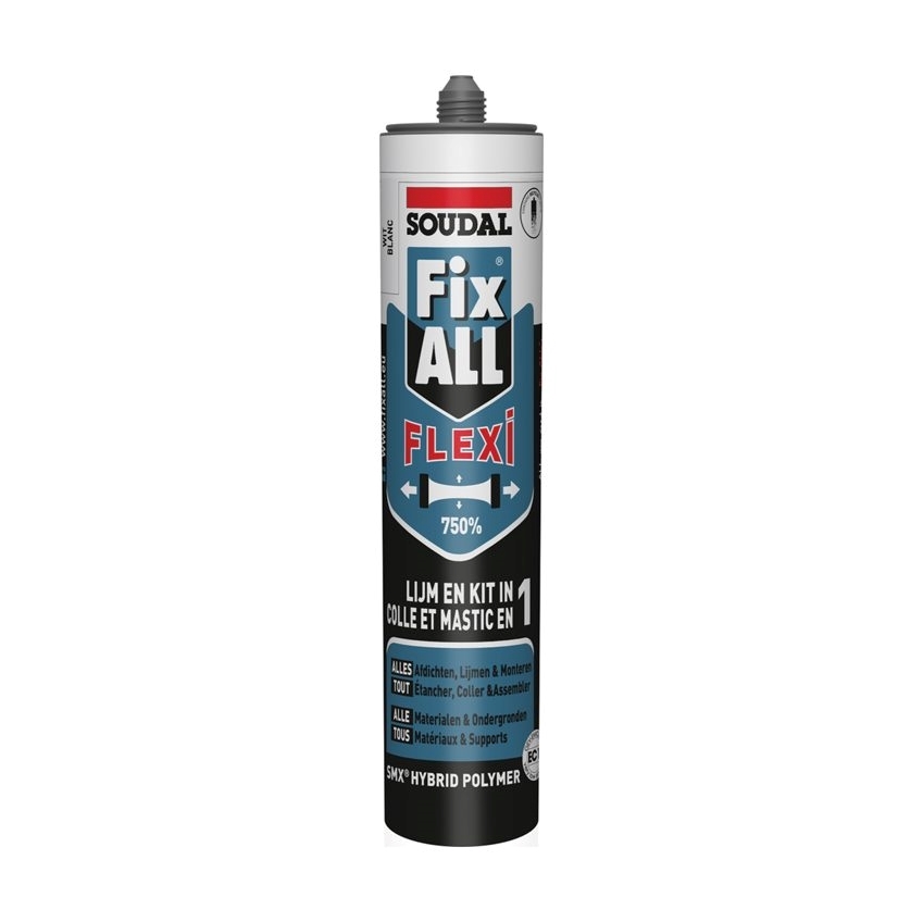 Soudal Fix All Flexi (Classic) is een hybride lijmkit en een universele, hardelastische lijm- en voegkit op basis van SMX® Polymer Technology. Geschikt voor krachtige, elastische verlijmingen van alle materialen op alle ondergronden. Eveneens uiterst geschikt voor alle sanitaire, binnen- en buitenvoegwerk. Ook op vochtige, niet poreuze ondergronden. Overschilderbaar met de meeste watergedragen verven.