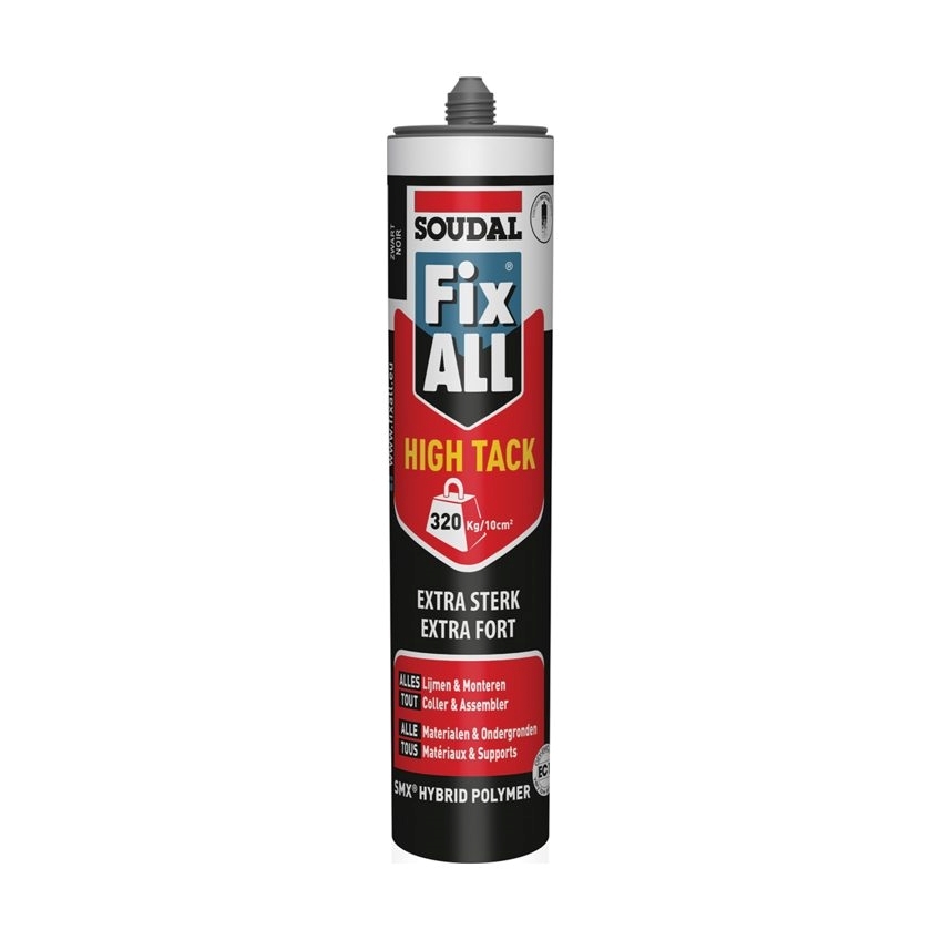 Soudal Fix All High Tack is een hybride lijmkit en een ultrasterke elastische verlijmingskit met zeer hoge initiële kleefkracht op basis van SMX® Polymer Technology. Voor uiterst sterke verlijmingen op alle materialen. Ook op vochtige, niet poreuze ondergronden.