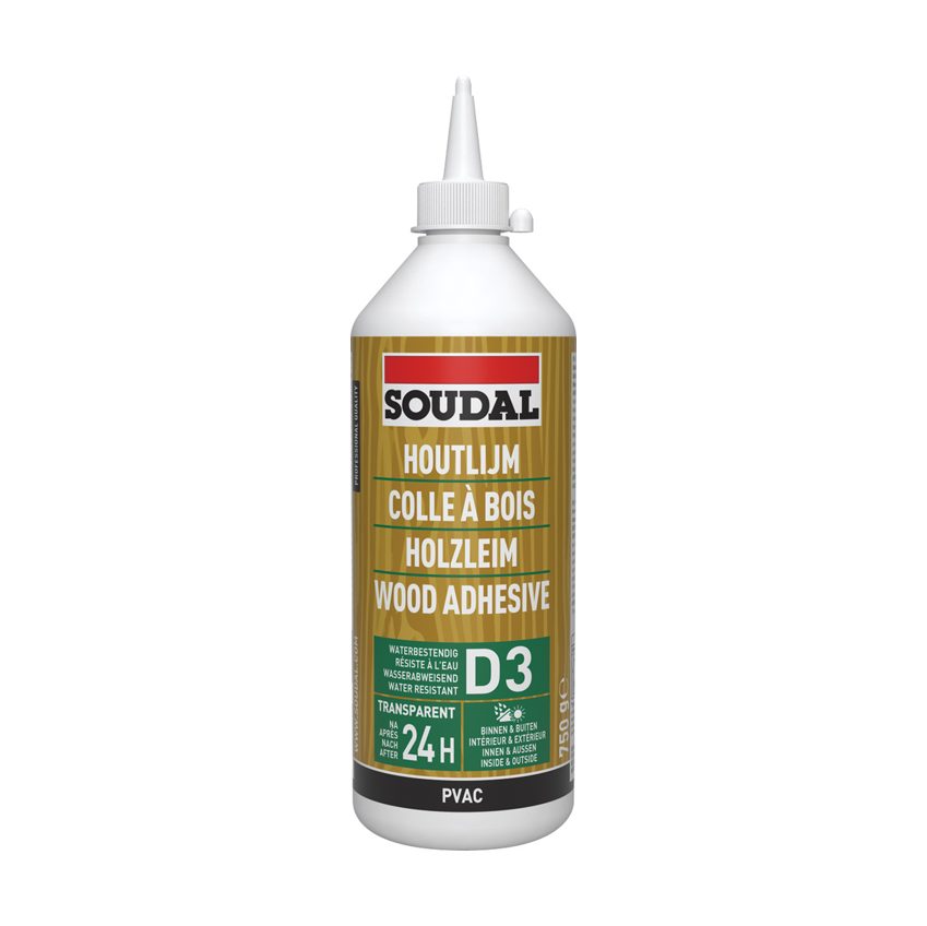 Soudal houtlijm (watervast) Pro30D is een sneldrogende dispersielijm voor het watervast verlijmen (EN 204 D3) van alle houtverbindingen. Zeer geschikt voor harde houtsoorten (eik, tropisch hout, teak, enz.). Geschikt voor binnen en buiten.