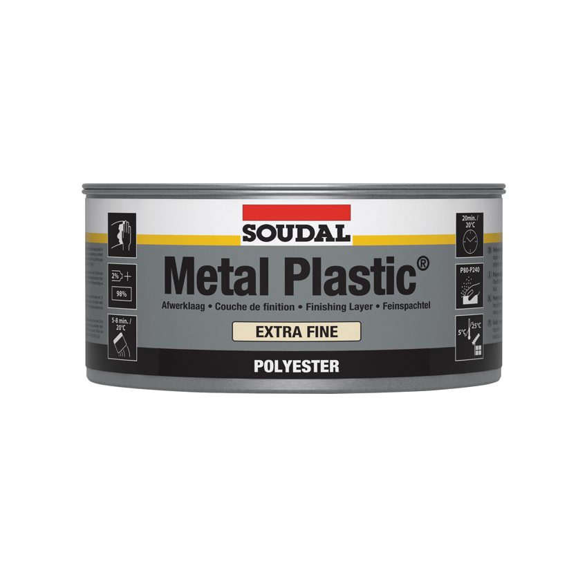 Soudal Metal Plastic Standard is een twee-componenten polyesterplamuur van hoge kwaliteit voor het herstellen van beschadigde oppervlakken (krassen, deuken en scheuren) in metaal, hout of polyester.