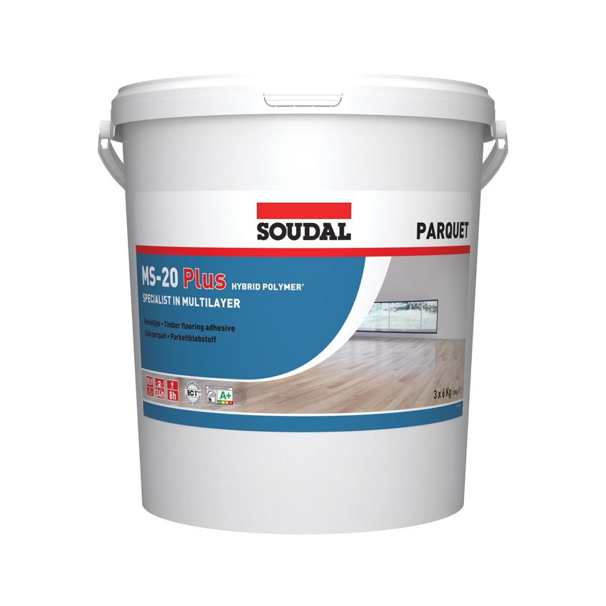 Soudal Parketlijm MS-20 Plus is een universeel inzetbare elastische parketlijm, vrij van water en oplosmiddelen. Zeer geschikt voor het verlijmen van meerlaags parket (max. 200mm breed, 14mm dik) en smal massief parket(max. 150mm breed, 12mm dik).