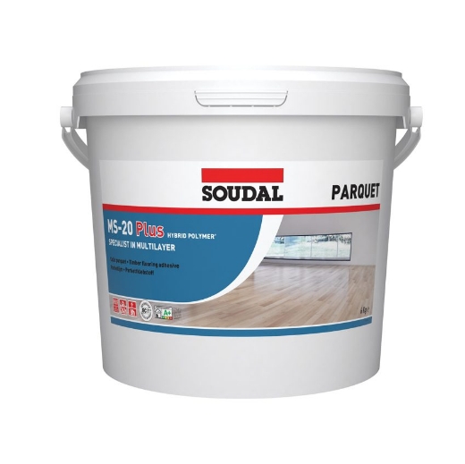 Soudal Parketlijm MS-20 Plus is een universeel inzetbare elastische parketlijm, vrij van water en oplosmiddelen. Zeer geschikt voor het verlijmen van meerlaags parket (max. 200mm breed, 14mm dik) en smal massief parket(max. 150mm breed, 12mm dik).