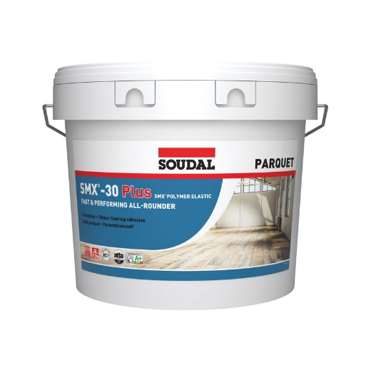 Soudal SMX-30® Plus Parketlijm is een ultra krachtige, hard elastische parketlijm met een zeer snelle krachtopbouw en hoge eindsterkte, gebaseerd op Soudal's SMX hybride polymeer technologie, geschikt voor het verlijmen van alle types parket. Hij is verder ook vrij van water, isocyanaat en oplosmiddelen. Zeer geschikt voor het verlijmen van breed massief parket (max breedte 200mm x min. dikte 16mm) op geschikte ondergronden binnenshuis of meerlaags parket met een maximale breedte van 280mm en een minimale dikte van 16mm. Met een zeer lage emissie rating (EC-1Plus)