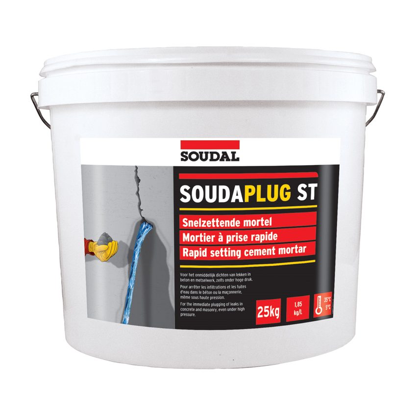 Soudal Soudaplug ST is een cement-gebaseerd poeder dat met water gemengd kan worden om een snel uithardende hydrofobe mortel te maken. Soudaplug ST is geschikt voor het onmiddellijk dichten van lekken in beton en metselwerk, zelfs onder hoge druk.