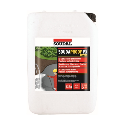 Soudal Soudaproof FX Component A is een poeder bestaande uit cement en additieven. Soudaproof FX Comp B is een polymeerdispersie op waterbasis. Na menging hardt Soudaproof FX uit tot een flexibele, waterdichte coating geschikt voor zwembaden, reservoirs, balkons en terrassen.
