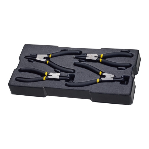 De vierdelige set bevat twee binnen- en twee buitenborgringtangen, met rechte en gebogen punten voor veelzijdige toepassingen. Alle gereedschappen zijn georganiseerd in een modulaire Transmodule-lade, zodat ze netjes opgeborgen en gemakkelijk toegankelijk zijn.