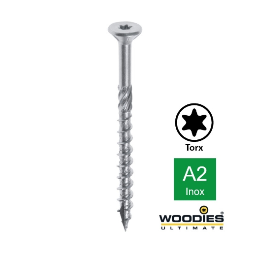 De Woodies® Ultimate houtschroeven met deeldraad, Torx TX30-aandrijving en verzonken kop zijn vervaardigd uit roestvrij staal (A2) voor uitstekende corrosiebestendigheid, ideaal voor buitengebruik en vochtige omgevingen.